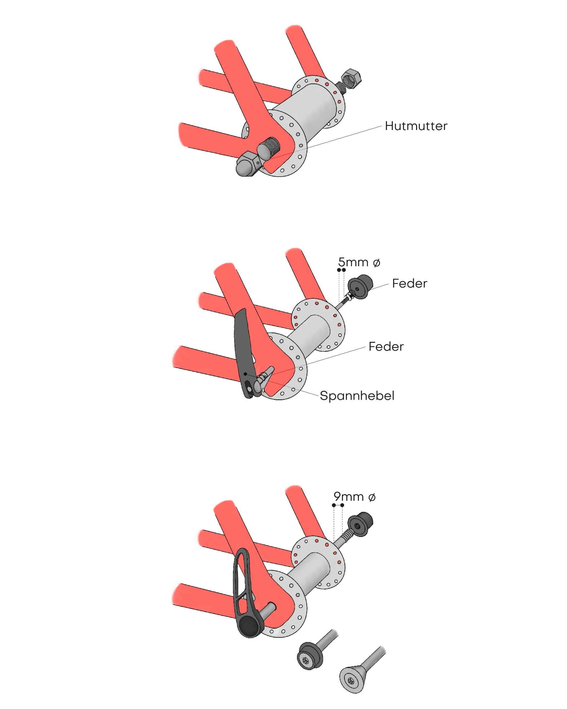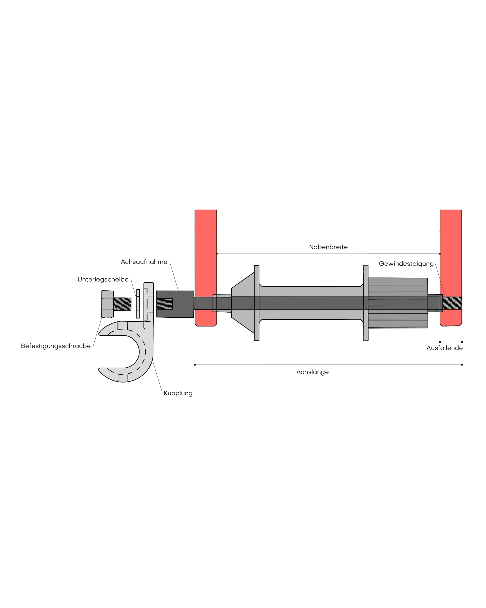 • Quick release axle: The coupling is pushed onto the new quick release axle and fixed with a washer and hexagon screw.