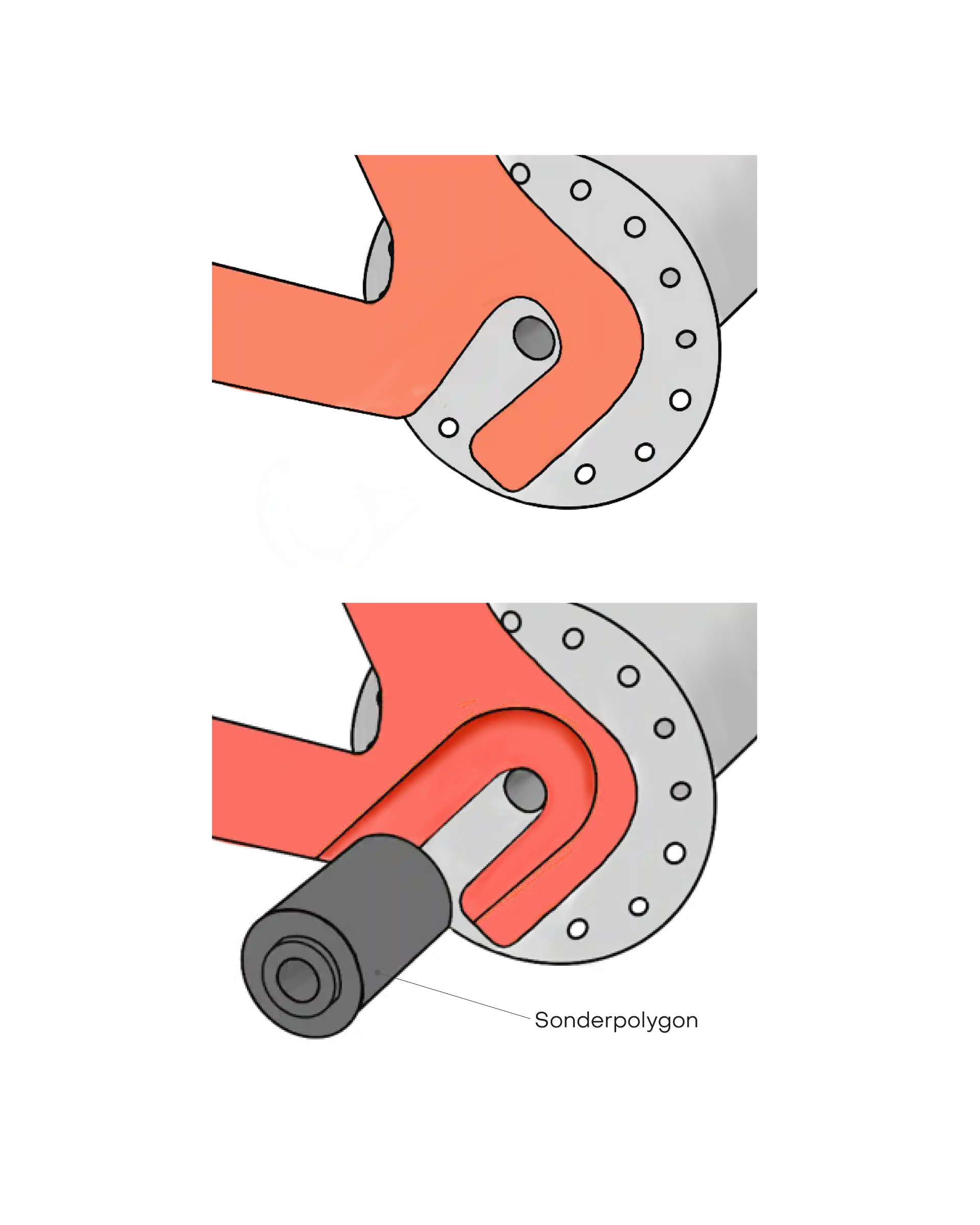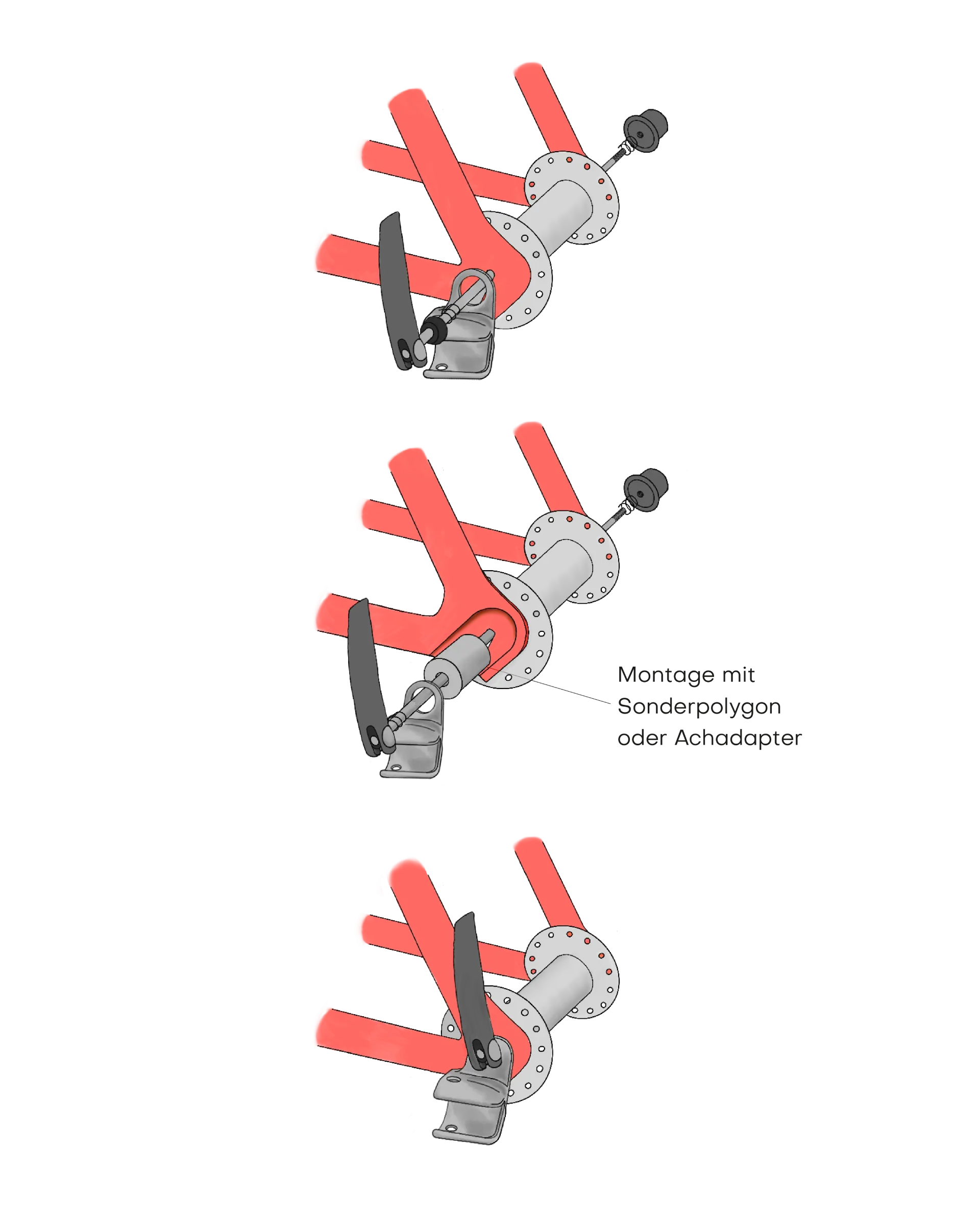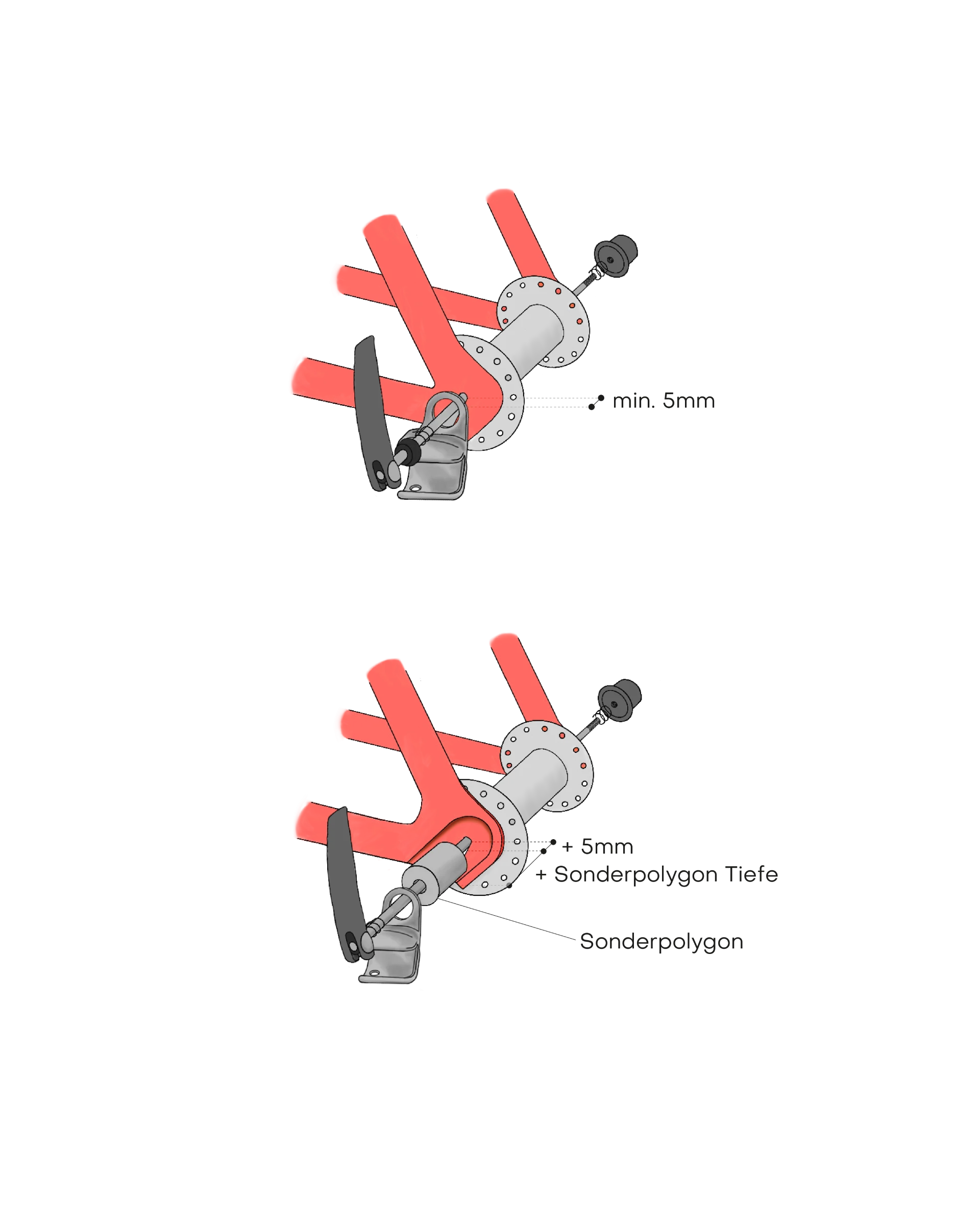 • Frame recessed: You have to compensate for the recess with a special polygon and need a longer quick release axle that is the depth of the special polygon and a further 5 mm longer than the old quick release axle.