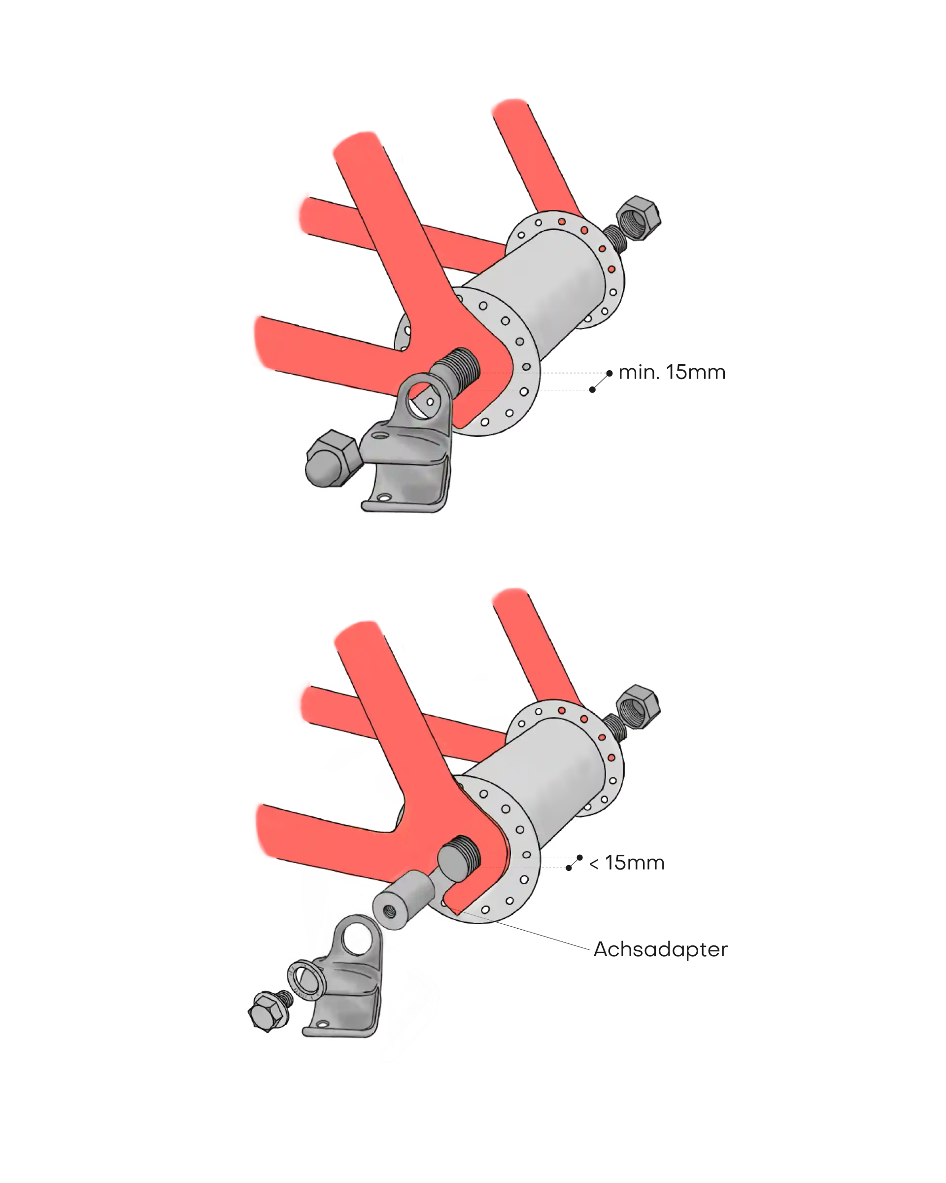 • Compare the illustration in the assembly instructions with your thru axle to determine the axle length, axle mount and thread pitch and to find the right thru axle.