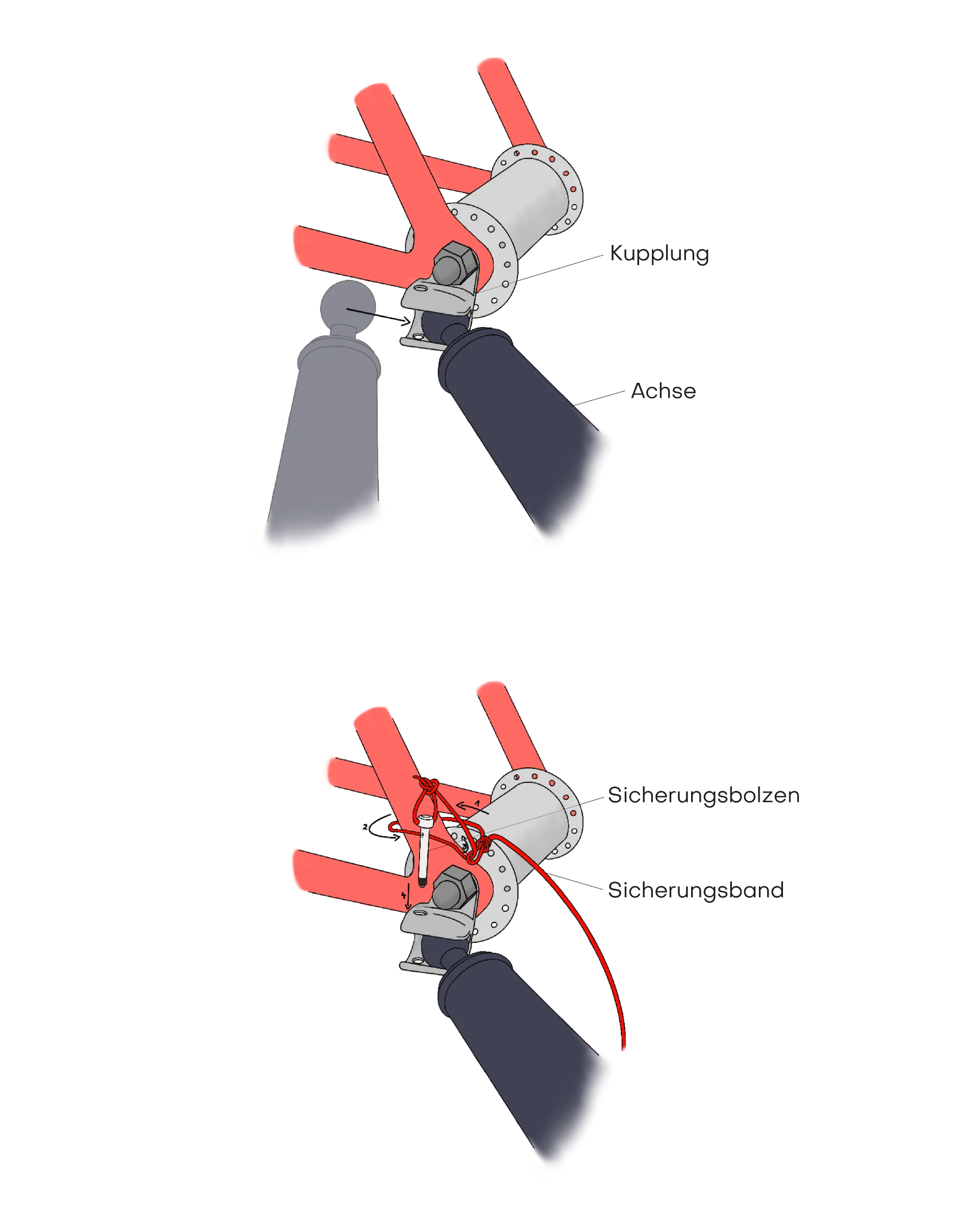 The standard coupling is a tried and tested system similar to the Thule bicycle coupling, which consists of a ball head on the drawbar and the matching counterpart on the bicycle . A cotter pin and a safety rope ensure that the trailer is securely attached with almost no play. This system is durable, hardly noticeable and is installed by us as standard. We supply the counterpart for the bicycle.
